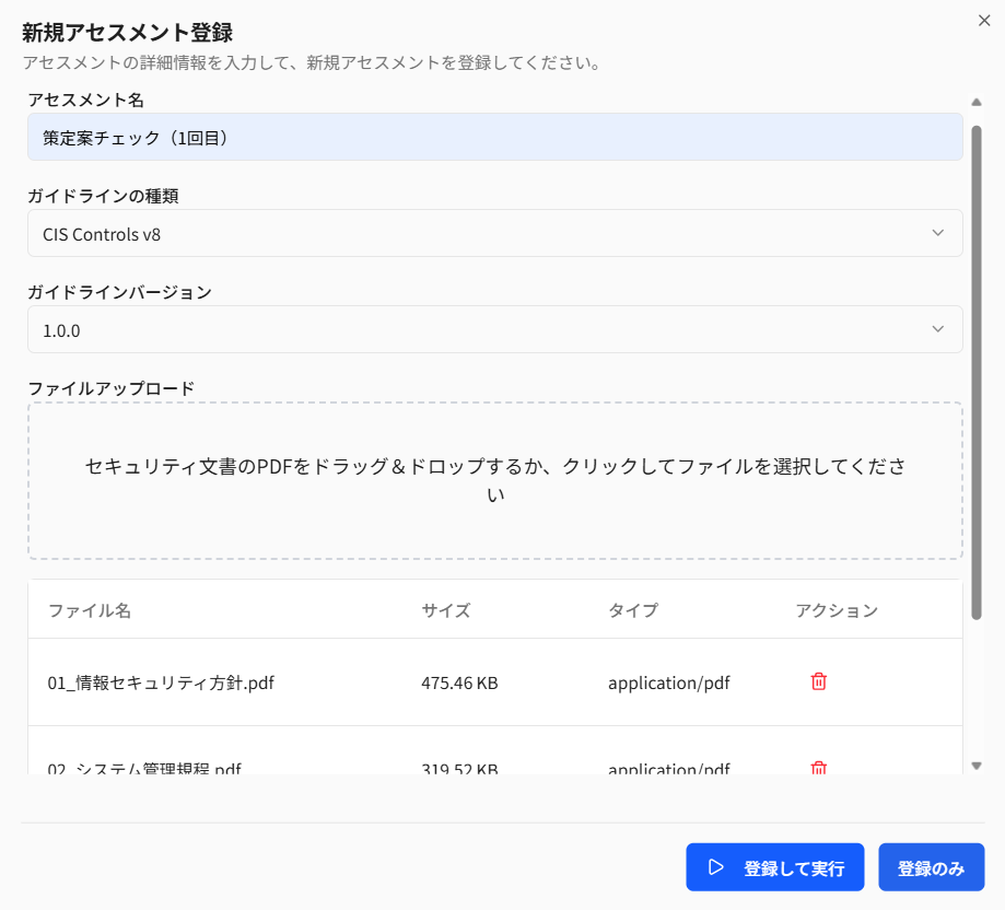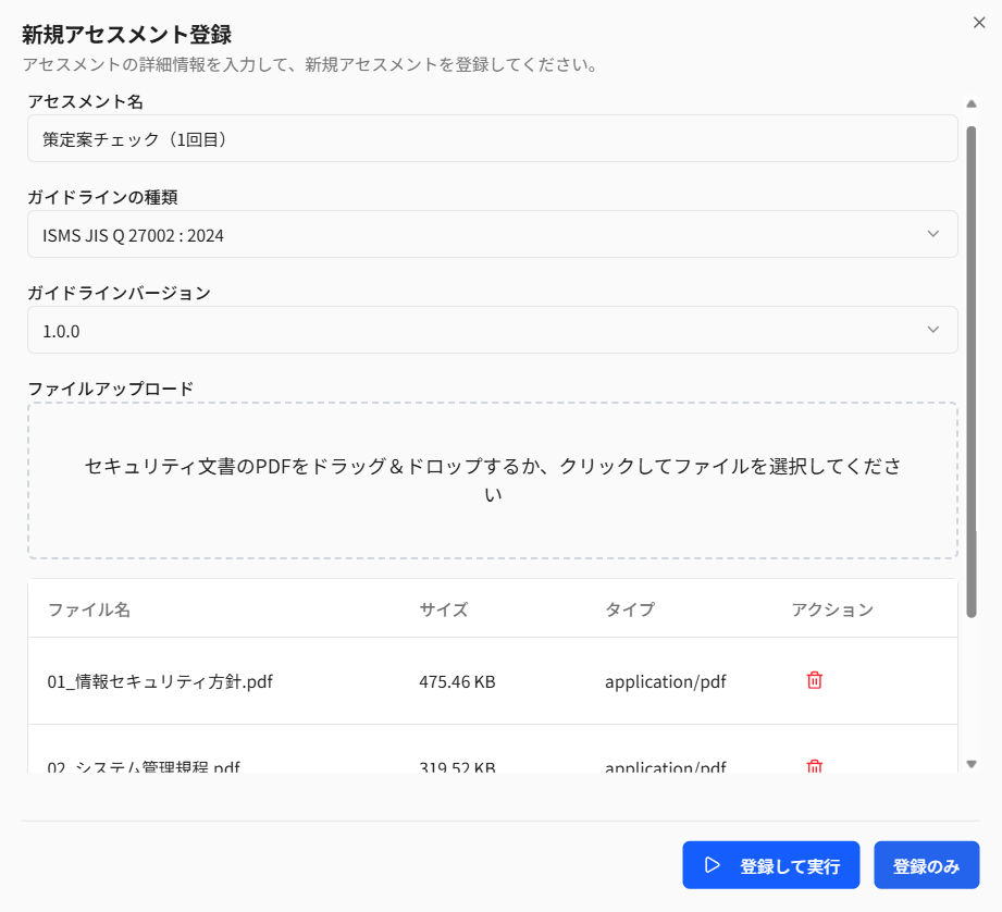 セキュリティ規程や手順書などの文書ファイルをアップロードするだけで、